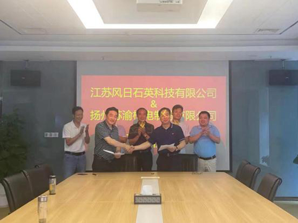 随后,江苏风日石英科技有限公司总经理魏元柏教授和扬州苏渝精工机械总经理赵俊龙签订了共建高端石英砂生产研发基地协议并合照留恋。